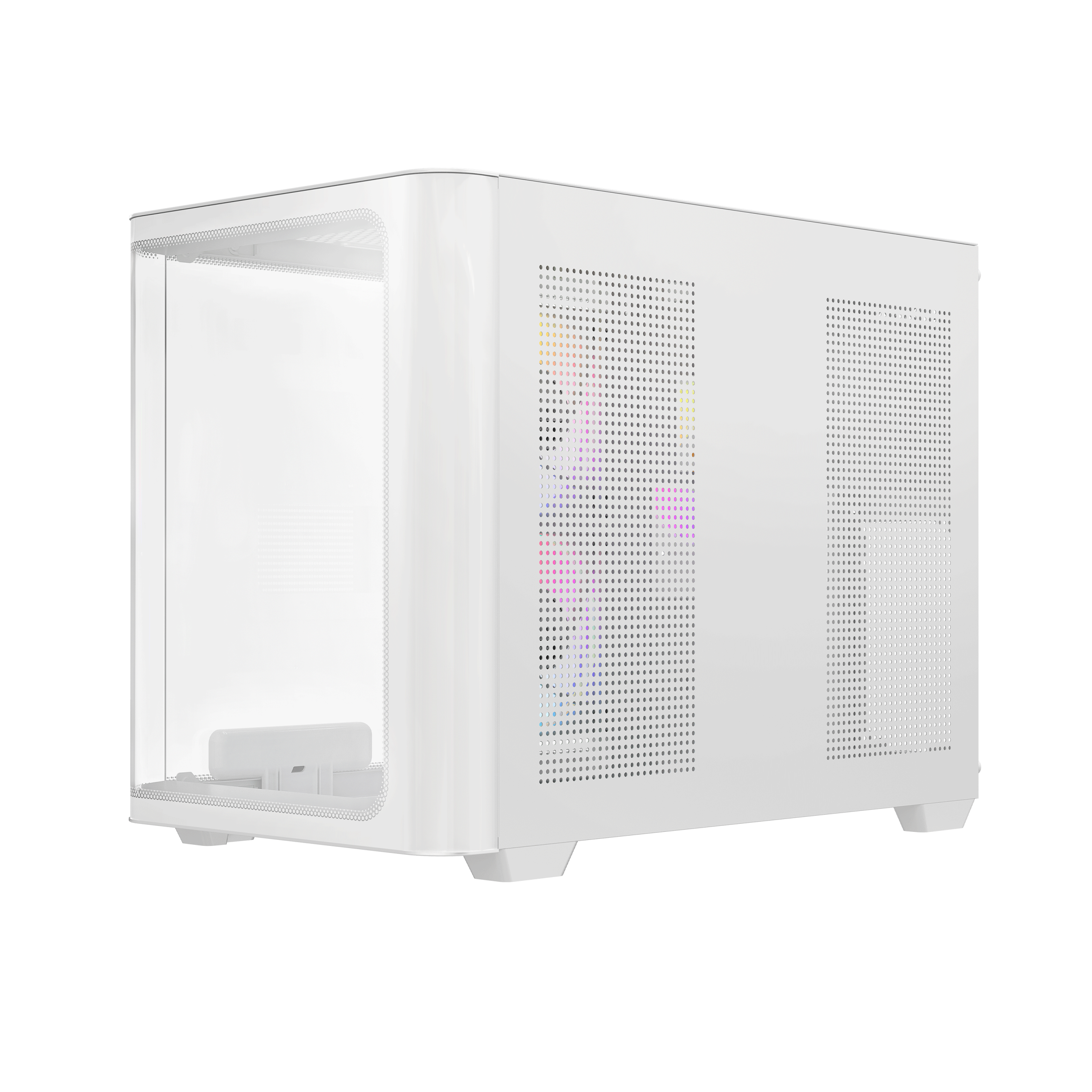 The OCYPUS Iota C50 WH Curve ARGB Digital is a masterpiece of compact engineering, bringing a panoramic visual experience to the Mini-Tower form factor. Designed for builders who value both aesthetics and performance, this chassis features a seamless 270-degree curved tempered glass panel that wraps effortlessly from the front to the side. By eliminating the corner pillar, the Iota C50 provides an uninterrupted “fish tank” view of your components, making it the perfect stage for high-end hardware. The pristine white finish is complemented by organic raindrop-patterned accents etched onto the glass, adding a touch of vitality and unique character that distinguishes your build from the rest.